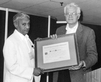 Jag has always brought out the best in our community," said James Glimm (right) on presenting a certificate of commendation to Jagdish Chandra, long-time director of mathematics and computer science at the Army Research Office. Chandra, who retired from ARO in 1997, becoming deputy director for information science and technology at the Army research lab in Adelphi, Maryland, was commended by SIAM "for his exemplary service and leadership in the development of basic research programs in applied and computational mathematics." During his tenure at ARO, the citation continues, "he played an unparalleled role in setting directions of research in applied mathematics and computer science." Especially noteworthy was his support for innovative programs in intelligent control systems, which "helped establish the United States as a world leader in this field. In addition, his strong support of creative expository writing provided a unique mechanism to disseminate new breakthroughs in mathematical research."