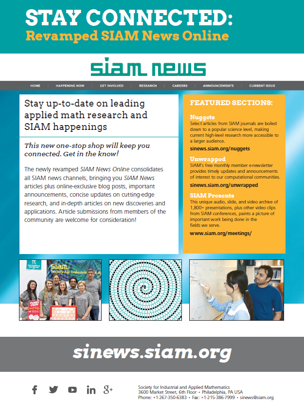 This is your one-stop-shop to stay up-to-date on leading applied math research, SIAM happenings and so much more. Stay in the know. Article submissions are also welcome!